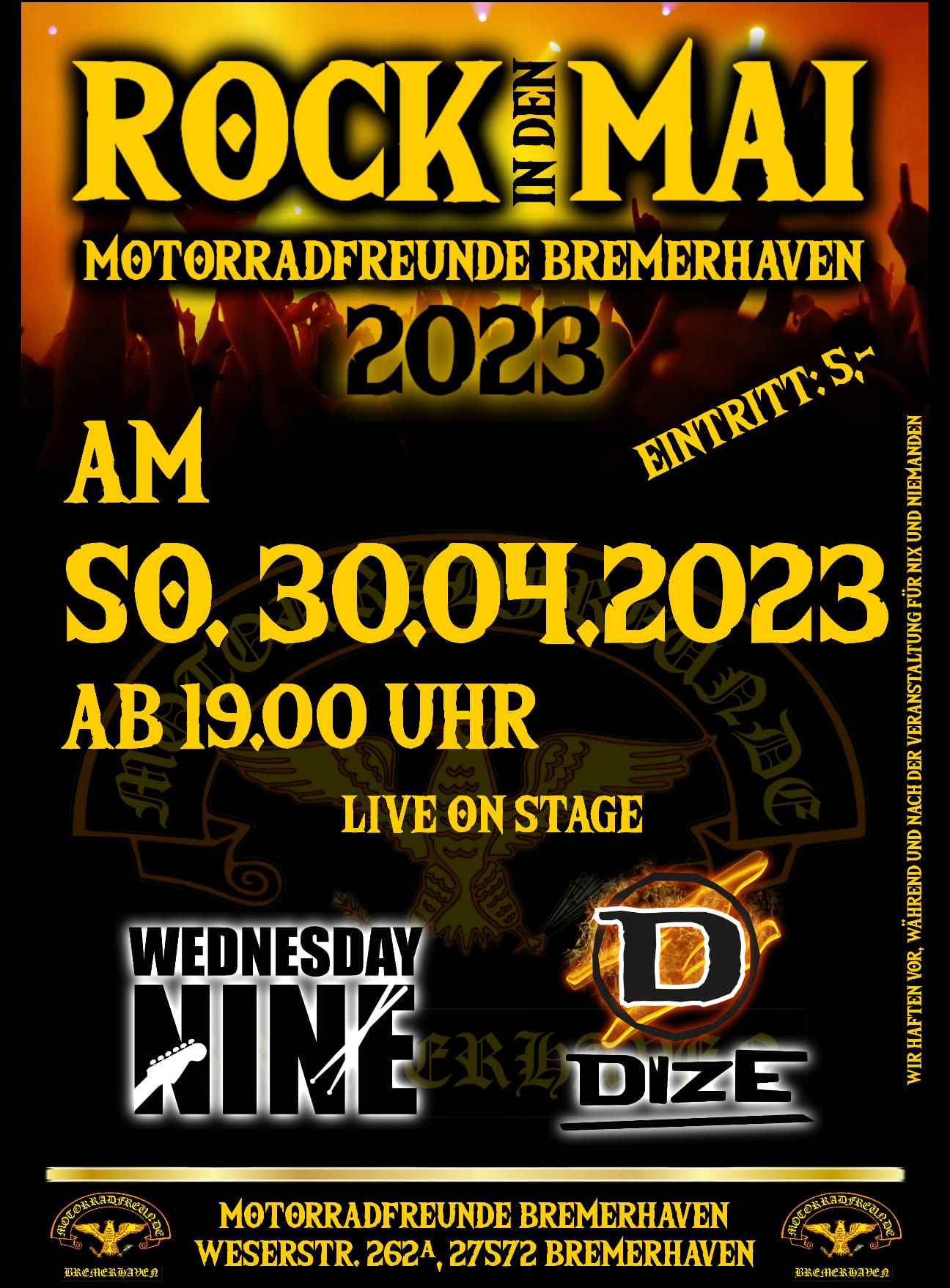 Wednesday Nine und Dize rocken gemeinsam bei den Motorradfreunden Bremerhaven. Eine coole Location und eine tolle Atmosphäre und dazu Rock und Metal. Das garantiert einen sensationellen Abend!